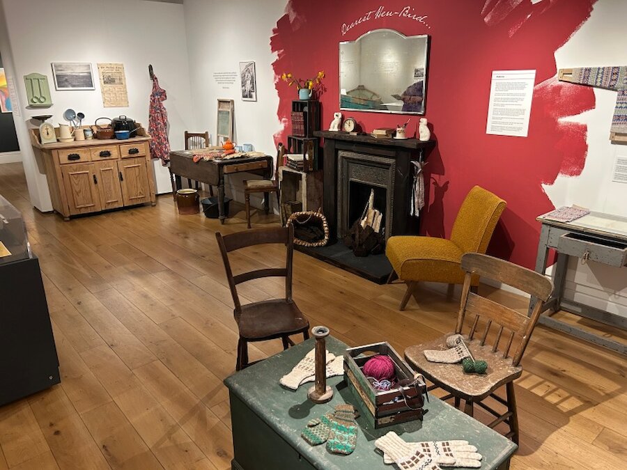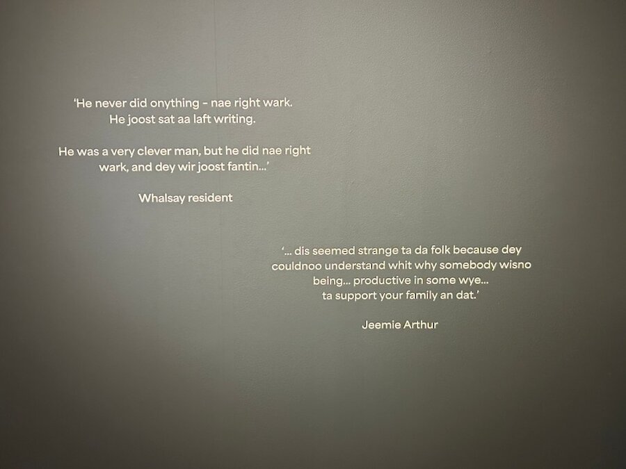 Thanks to the Whalsay History Group, it has been possible to display the boat used by Macdiarmid when journeying to the small island of Linga, inspiration for his celebrated poem, On a Raised Beach. The Grieves’ grandsons are seen here with the fourareen (meaning four oared). It’s a striking element in the display, but there is also a wealth of personal and archival material that evokes the realities of their daily life in Whalsay.
