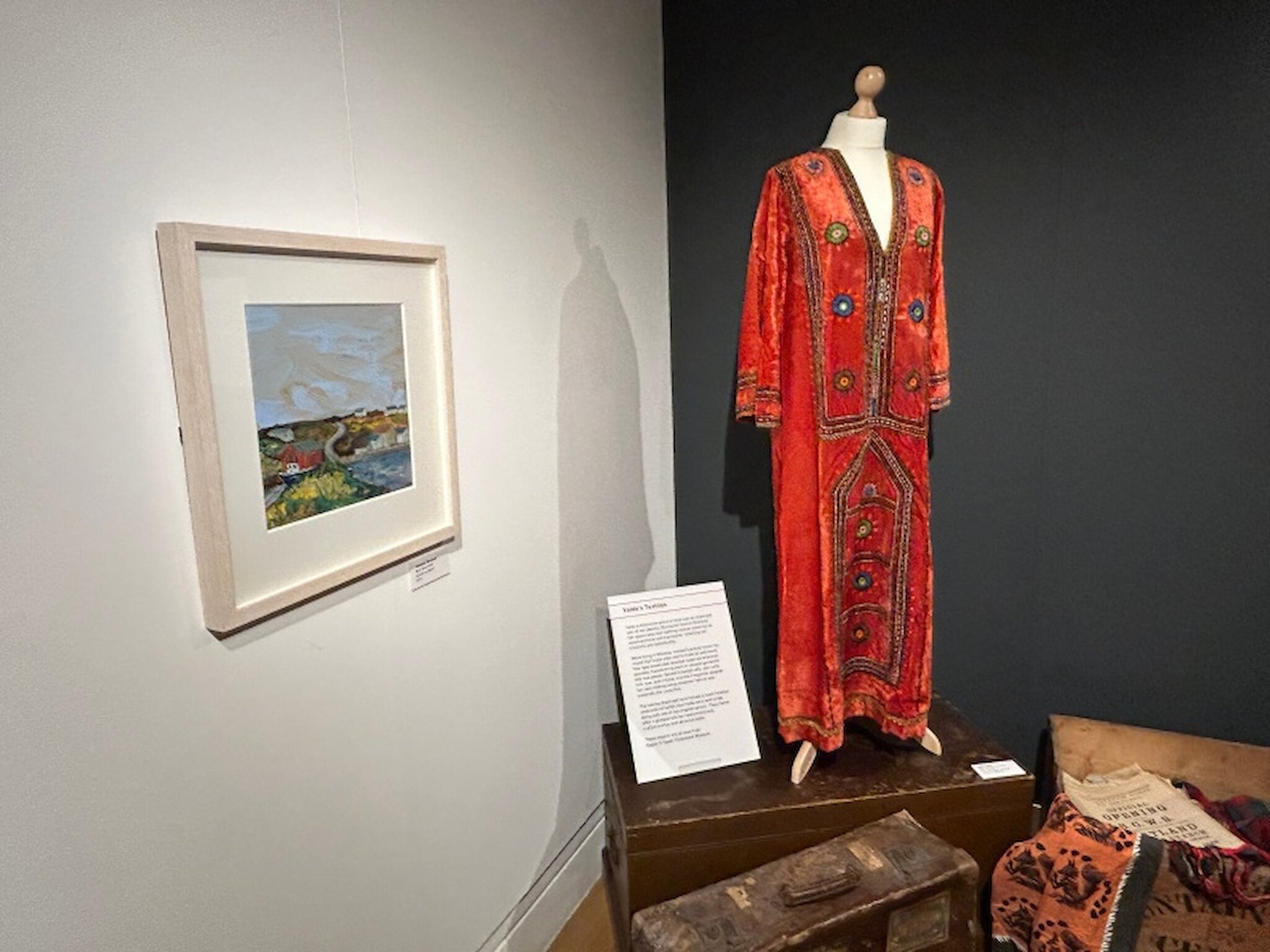 This is reflected in a setting inspired by their home, featuring her knitting jotter and replica knitted garments. It seems that, whilst she clearly got on well with her neighbours, she surprised them by, among other things, wearing trousers at a time when that was not customary. Another exhibit, on loan from the Macdiarmid collection in Biggar, is a magnificent kaftan that emphasises her style, which was arguably two or three decades ahead of its time.