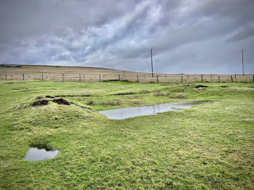 The site is now considerably landscaped, although a period of overcast, dreich weather had caused standing water to gather, highlighting the position close to the former manse and congregational chapel on the north side of Sullom Voe.