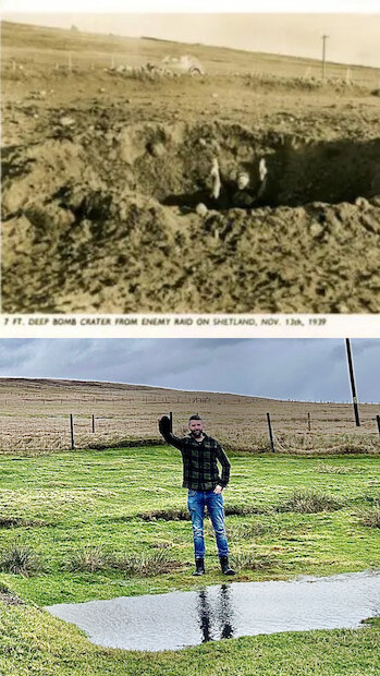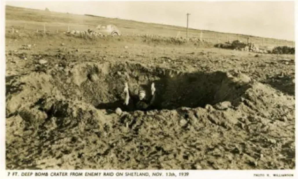 A local photographer sent to record the aftermath of the air raid at Sullom was Robert Williamson. He called at a local butcher en route from Lerwick to document the event, purchasing several rabbits as photographic props.