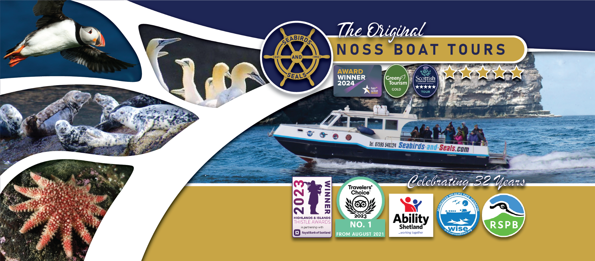 Multi-award-winning Seabirds-and-Seals offers you the ultimate wildlife experience on board their catamaran 'Seabird' with daily trips around Bressay and Noss National Nature Reserve. They provide three different tour start times, sometimes four due to demand, check their website booking calendar to find daily tours available. Seabirds-and-Seals enjoyed a double win at The Highlands & Islands Thistle Awards 2023 for 'Best Visitor Attraction' & 'Inclusive Tourism' categories.
